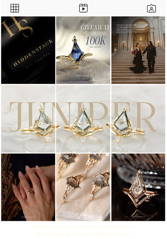 As Creative Director, I led a complete brand transformation and drove exponential growth for both the brand and the business – overseeing photography, social media, graphic design, copywriting, and overarching creative strategy. I redefined bridal femininity, moving away from soft florals and pastel palettes to a bold, cinematic identity inspired by the raw, mysterious beauty of salt and pepper diamonds. These perfectly imperfect stones became a metaphor for complexity and individuality, and the brand evolved to reflect that: confident, independent, and effortlessly elegant with a timeless edge.